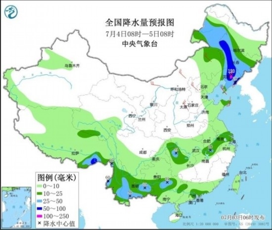 全國降水量預(yù)報圖(7月3日08時-4日08時)。圖片來源:中央氣象臺網(wǎng)站