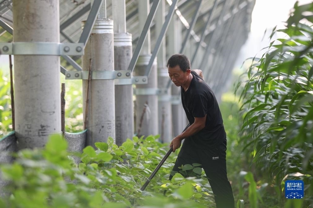 7月11日,在遼寧省彰武縣馮家鎮(zhèn)哈大冷村,村民為太陽(yáng)能光伏電板下方的作物除草。