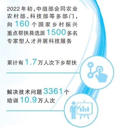 2022年初,中組部會同農(nóng)業(yè)農(nóng)村部、科技部等多部門,以“一縣一團”方式,向160個國家鄉(xiāng)村振興重點幫扶縣選派1500多名專家型科技支撐人才,精準開展科技服務和人才培養(yǎng)幫帶。