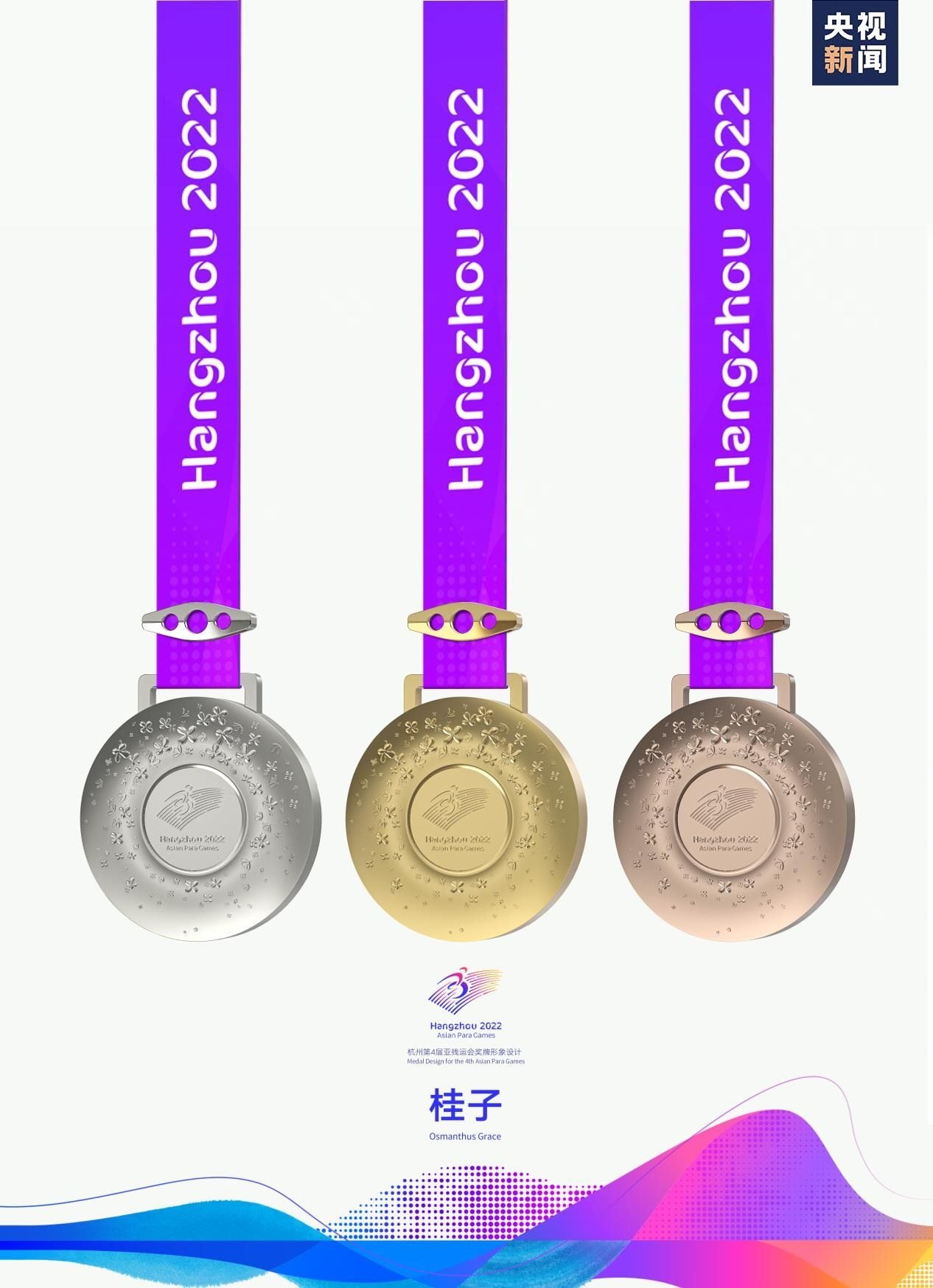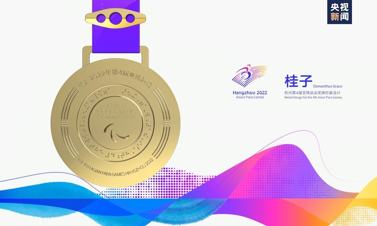 獎牌取名為“桂子”,源自描寫杭州的名句“山寺月中尋桂子”,寓含江南意境和浪漫色彩。系繼會徽“向前”,吉祥物“飛飛”,色彩系統(tǒng)“潤澤”,火炬“桂冠”后又一杭州亞殘運會視覺形象體系的核心元素,是亞殘運文化美學的重要表達。
