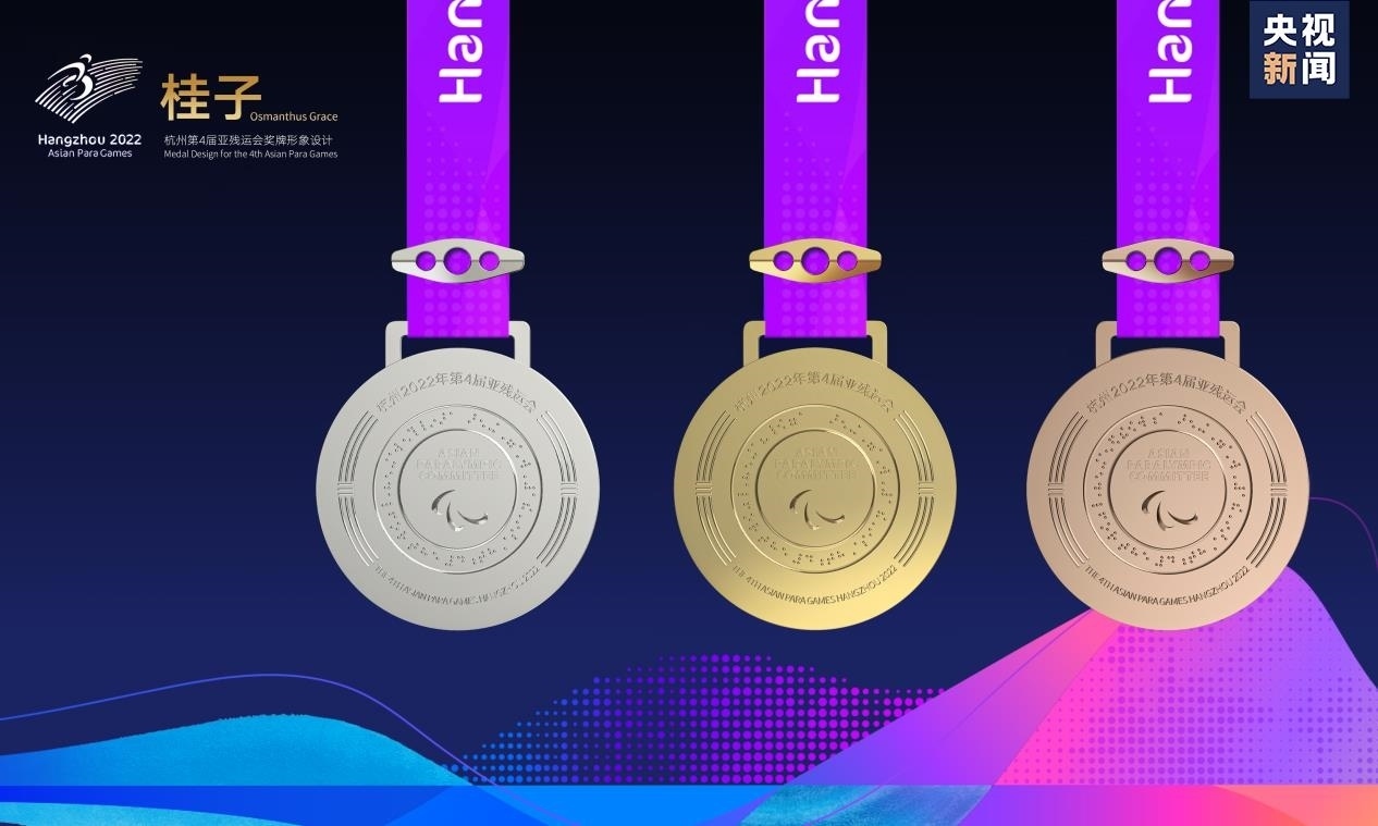 獎牌正面由桂花與杭州亞殘運會會徽組合而成;背面則以亞殘奧委會標志為中心環(huán)繞盲文,具有很高的辨識度,其中盲文的釋義為:杭州第4屆亞殘運會金牌(銀牌、銅牌)。