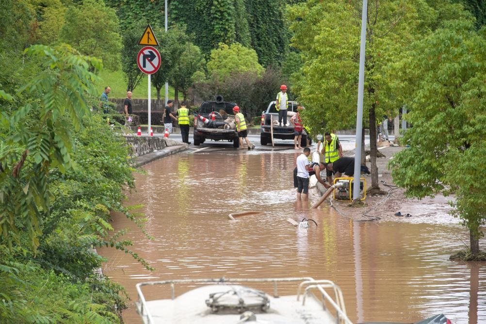 7月14日,在重慶市萬州區(qū)江南新區(qū),救援人員進行排水搶險作業(yè)。新華社記者 唐奕 攝