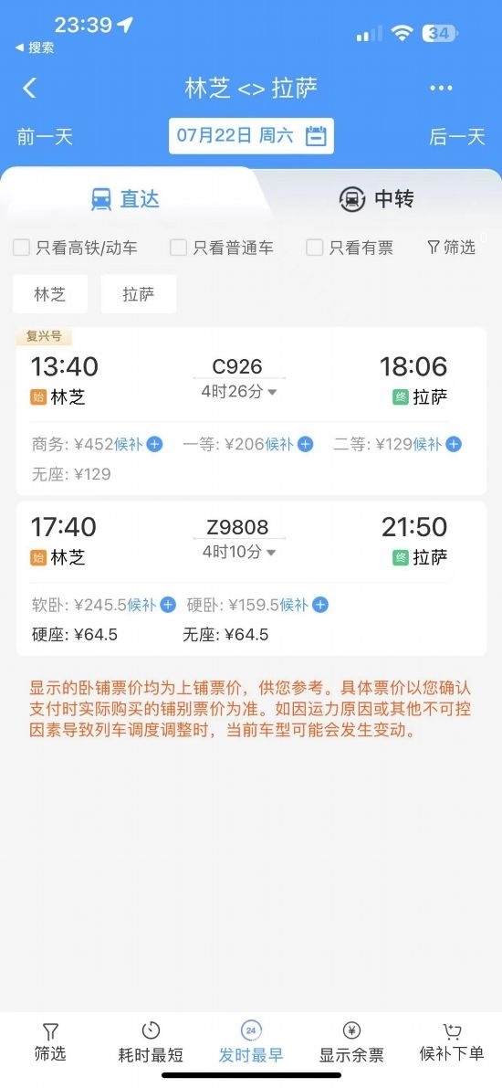 通過在鐵路售票APP上查詢發(fā)現(xiàn),從林芝開往拉薩的復(fù)興號(hào)城際列車的二等座票價(jià)為129元,直達(dá)特快列車硬座為64.5元?!跋啾容^原先180元的客運(yùn)汽車票價(jià),直達(dá)特快列車便宜了近乎三分之一?!辈芟壬锌卣f道。