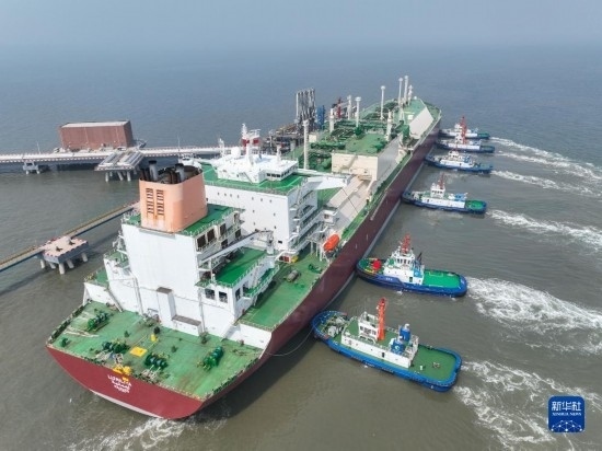 一艘LNG運輸船靠泊在唐山港曹妃甸港區(qū)(2023年6月18日攝,無人機照片)。新華社發(fā)(趙亮攝)