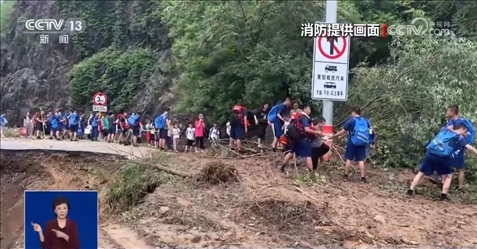 8月2日上午,現(xiàn)場總指揮決定護(hù)送自愿離開的被困群眾進(jìn)行撤離。在撤離的隊(duì)伍中,有38名來自新疆參加北京游學(xué)的孩子,他們最小的6歲,平均年齡也只有8歲。為了保障轉(zhuǎn)移時(shí)的安全,撤離線路選擇了相對(duì)安全的盤山公路進(jìn)行。途中經(jīng)過落石塌方險(xiǎn)區(qū)的時(shí)候,消防員們依次排開,在斷崖旁形成人墻,用身體筑起一條防線。遇到水流,消防員們把孩子們抱著傳遞到安全位置再繼續(xù)前行。