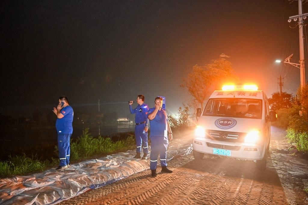 8月4日,在大清河天津靜海段北堤,天津靜海藍(lán)天救援隊(duì)隊(duì)員夜間巡堤時(shí)發(fā)現(xiàn)隱患點(diǎn)后,通過燈光指引和對講機(jī)呼話,與南堤隊(duì)員協(xié)同處理。新華社記者 孫凡越 攝