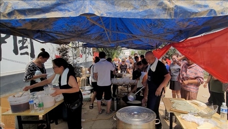在涿州市刁窩鎮(zhèn)西茨村臨時飯點,村民們排隊領(lǐng)取飯菜。新華社記者蘇凱洋 攝