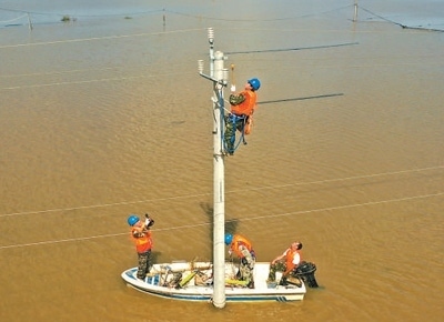 8月9日,國網(wǎng)長春供電公司搶修人員在吉林省榆樹市懷家12組進(jìn)行作業(yè),為受災(zāi)群眾恢復(fù)生活用電。孟海鷹 張 鵬攝影報道