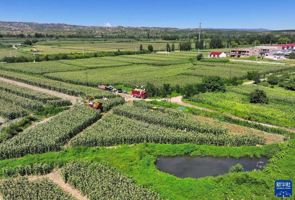 8月13日,在張家口市萬(wàn)全區(qū)盆窯村鮮食玉米種植基地,農(nóng)民收獲鮮食玉米(無(wú)人機(jī)照片)。