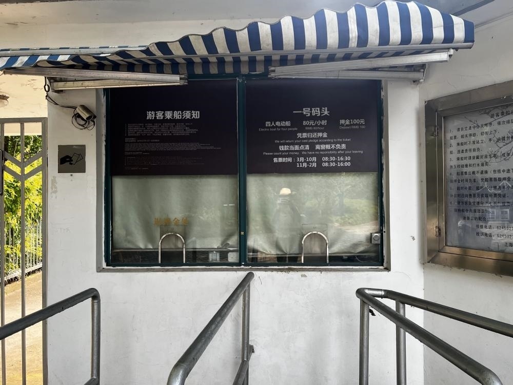 當記者問起是否有現(xiàn)金購買渠道時,工作人員指路了附近的人工售票窗口,同時補充道:“收受現(xiàn)金的售票員有時會離開崗位,不久會回來?!庇浾咴诖说赝A袅艘恍r,注意到長風公園內(nèi)類似的售票窗口有兩個,營業(yè)至16:30。然而,整整一個小時內(nèi),兩個窗口均無人在崗。
