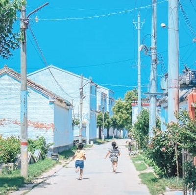 劉莊村的孩子們在村路上嬉戲。
