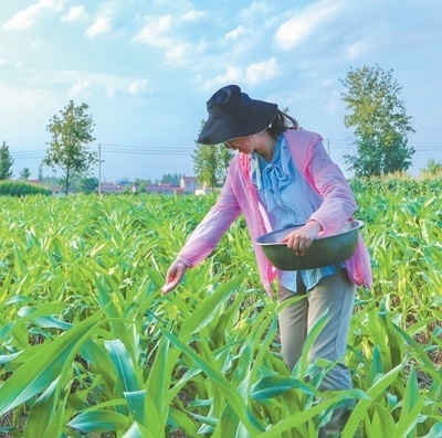 記者在玉米地里撒肥。