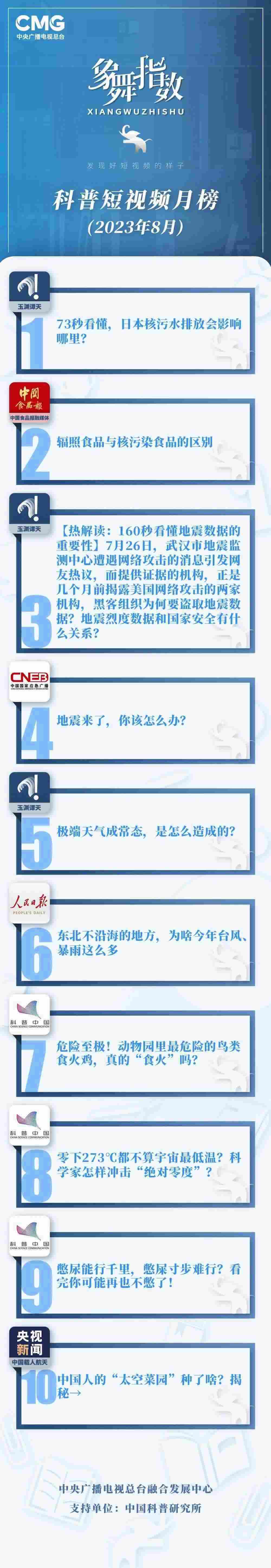 中央廣播電視總臺“象舞指數(shù)”評議品牌,推出科普短視頻月榜、總臺科普短視頻月榜。在2023年8月,值得注目的內(nèi)容有:
