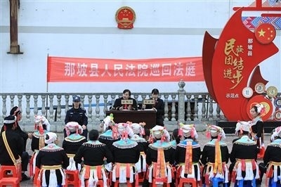 隆林各族自治縣人民法院以全國(guó)模范法官黃登林為榜樣,設(shè)立“登林巡回法庭”,創(chuàng)新運(yùn)用黃登林“五大調(diào)解法”,開(kāi)展壯漢、苗漢、彝漢等雙語(yǔ)巡回審判,滿足少數(shù)民族聚居地群眾的多元司法需求。同時(shí),在德峨人民法庭打造“登林巡回法庭·崢嶸廳”和“民族團(tuán)結(jié)同心苑”等文化場(chǎng)館,開(kāi)展雙語(yǔ)普法,奏響“最炫民族風(fēng)”司法文化品牌的新樂(lè)章。