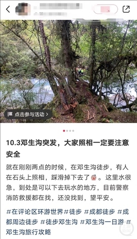 10月3日,游客艾女士(化名)發(fā)布圖片稱,當(dāng)天下午2點(diǎn)左右,在鄧生溝徒步,有人照相時(shí)踩滑掉落水里,水流非常湍急?!笆钦驹谑^上照相,踩滑了掉下去。聽到落水者兒子哭著給家里人打電話說的。”她還向上游新聞記者表示,落水者是一位女游客,事情發(fā)生后,警方、消防等都在展開救援。多位游客表示,該女游客已被找到,不過已經(jīng)去世。