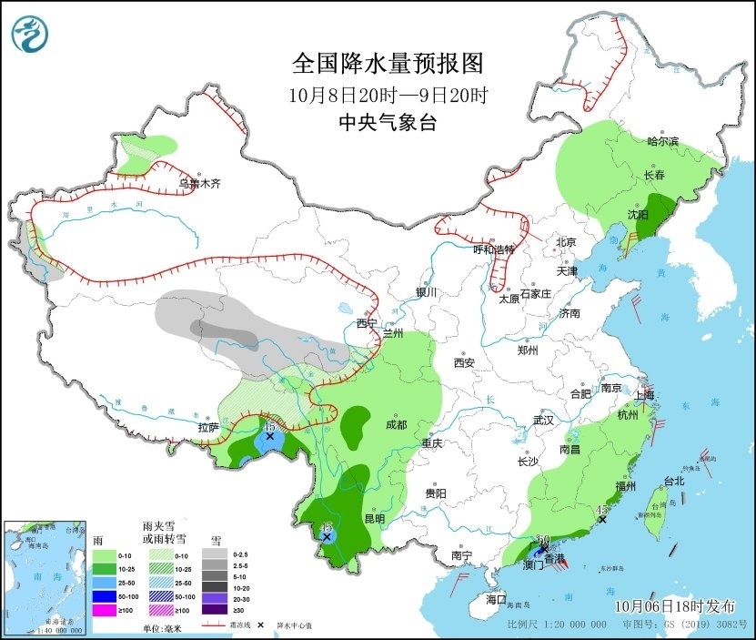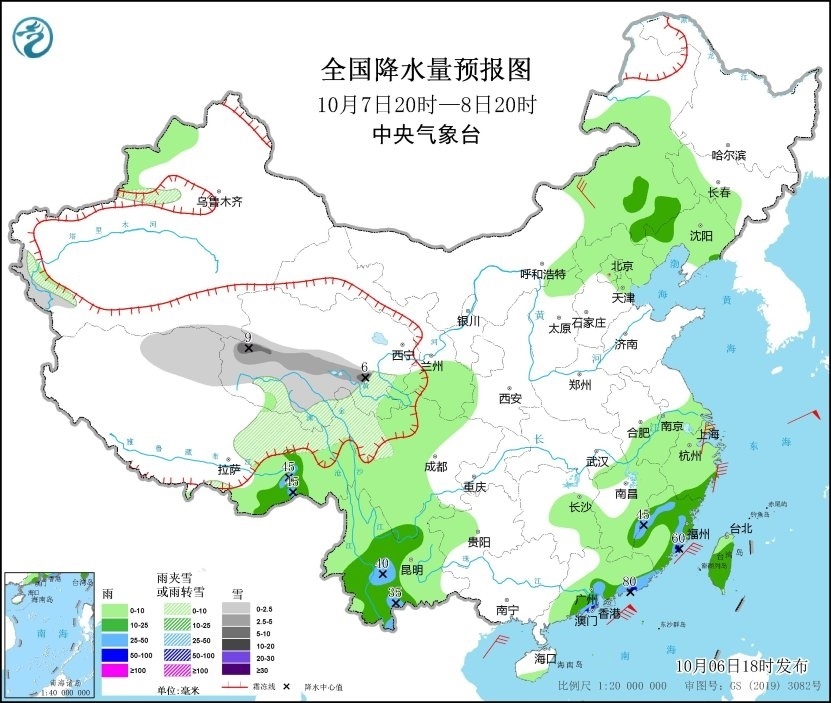 10月6日20時(shí)至7日20時(shí),新疆南疆盆地西部沿山地區(qū)、青海南部、西藏東部等地有小到中雪或雨夾雪;西藏東南部、四川盆地東部和南部、云南中東部、福建中南部、廣東東部、海南島南部、臺(tái)灣島西部等地部分地區(qū)有中到大雨,其中,廣東東部和福建南部沿海等地局部地區(qū)有暴雨(50~65毫米)。內(nèi)蒙古中東部、遼東半島、浙江東部沿海等地部分地區(qū)有4~6級(jí)風(fēng),西藏中部部分地區(qū)有6~7級(jí)風(fēng)。臺(tái)灣海峽將有6~7級(jí)、陣風(fēng)8級(jí)的東北風(fēng),南海東北部海域?qū)⒂?~9級(jí)、陣風(fēng)10級(jí)的偏北風(fēng)(見圖1)。