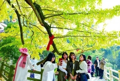 游客在貴州省貴陽市烏當(dāng)區(qū)羊昌鎮(zhèn)黃連村的古銀杏樹下留影。新華社發(fā)