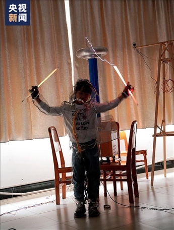 實驗展示過程中,屈老師手持熒光燈管,逐漸靠近特斯拉線圈,轉(zhuǎn)瞬之間,一道電流好像穿過他的身體,形成絢麗的火花,現(xiàn)場畫面仿佛置身科幻電影。
