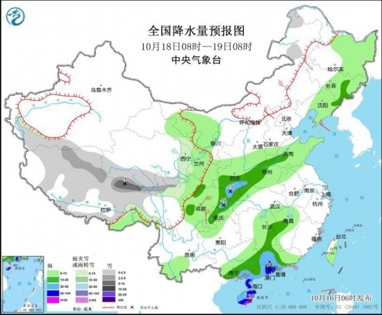 10月17日08時(shí)至18日08時(shí),新疆西南部山區(qū)、西藏、青海東部和南部、甘肅西部、川西高原北部等地的部分地區(qū)有小到中雪或雨夾雪,其中青海南部等地局地大雪;甘肅南部、陜西、山西中北部、四川北部、廣東中西部、海南島等地的部分地區(qū)有中到大雨,其中,海南島東部、廣東中部偏南地區(qū)局地有暴雨(50~90毫米)。內(nèi)蒙古中東部、廣西東南部、海南島等地的部分地區(qū)有4~6級(jí)風(fēng)。