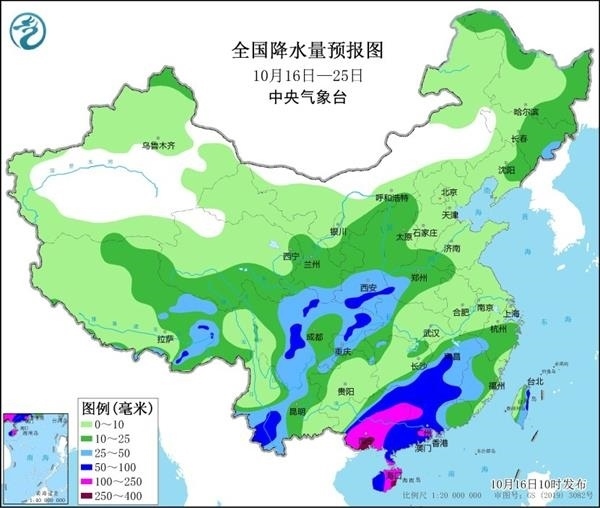 19日以后,隨著冷空氣南下,降水區(qū)域也將擴展到江南、華南等地。值得注意的是,華南地區(qū)由于水汽更充沛,再加上熱帶擾動影響,將成為強降雨中心。特別是廣西,暴雨或大暴雨將持續(xù)3至4天,這在常年10月中旬相當少見,當?shù)匦枳⒁夥婪冻掷m(xù)強降雨可能引發(fā)的次生災(zāi)害。