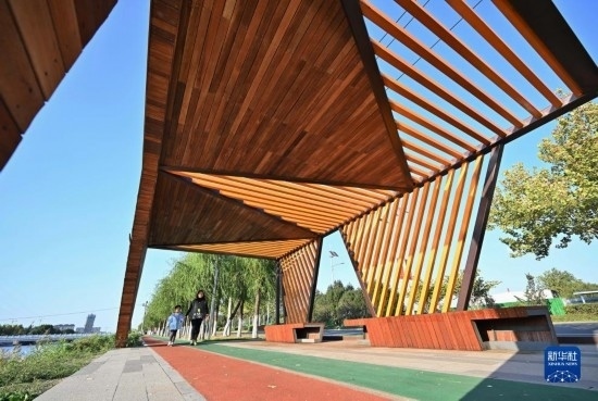 10月15日,市民從唐山市海港經(jīng)濟(jì)開發(fā)區(qū)城市休閑驛站走過。