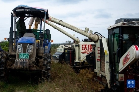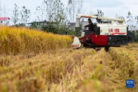 在湖北省天門市石家河鎮(zhèn)唐店村,農(nóng)民操作農(nóng)機收割水稻(10月19日攝)。