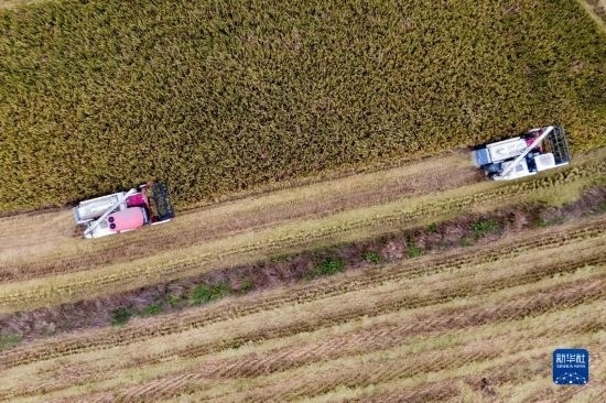 在湖北省天門市石家河鎮(zhèn)唐店村,農(nóng)民操作農(nóng)機收割水稻(無人機照片,10月19日攝)。