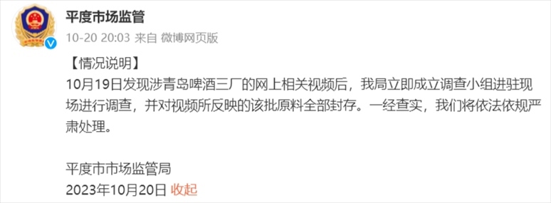《每日經(jīng)濟(jì)新聞》記者注意到,青島啤酒三廠所在地的平度市市場(chǎng)監(jiān)管局也發(fā)布情況說明稱,10月19日發(fā)現(xiàn)涉青島啤酒三廠的網(wǎng)上相關(guān)視頻后,我局立即成立調(diào)查小組進(jìn)駐現(xiàn)場(chǎng)進(jìn)行調(diào)查,并對(duì)視頻所反映的該批原料全部封存?!耙唤?jīng)查實(shí),我們將依法依規(guī)嚴(yán)肅處理。”