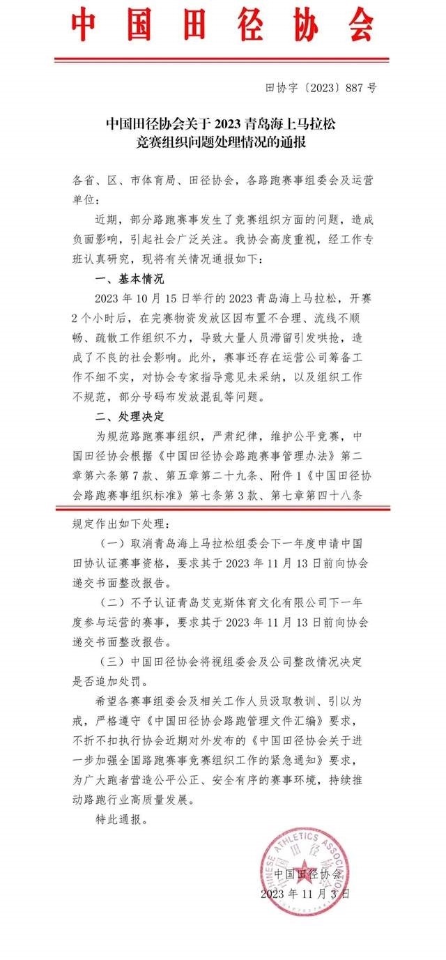 央視網消息:據(jù)“中國馬拉松平臺”官微消息,近日,部分路跑賽事出現(xiàn)了一些競賽組織問題,引發(fā)社會廣泛關注,造成了不良的社會影響。中國田徑協(xié)會高度重視、全面調查,依據(jù)事實和路跑賽事管理規(guī)定,從加強競賽組織,壓實各方主體責任,提示行業(yè)風險隱患的角度,對相關單位和人員進行了相應處理。現(xiàn)將處理情況通報如下: