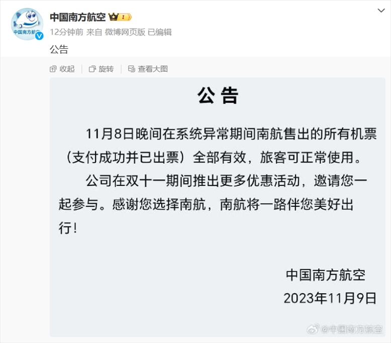 ·系統(tǒng)故障出現(xiàn)10元低價機(jī)票,南航回應(yīng):出票成功可正常出行。