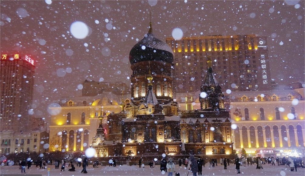 哈爾濱出現(xiàn)暴雪天氣,索菲亞教堂雪中如夢(mèng)如幻。
