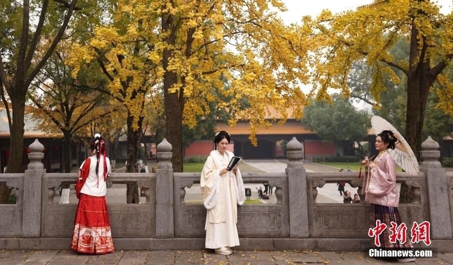 近日,南京朝天宮內的古銀杏披上“金甲”,與古樸的建筑相映襯,增添了一份“詩情畫意”。圖為民眾在古銀杏樹下拍攝照片。