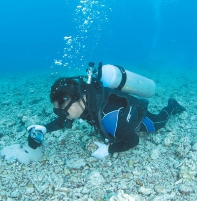 海南南海熱帶海洋研究所所長陳宏在珊瑚移植前進行海底環(huán)境調(diào)查。 于志龍攝