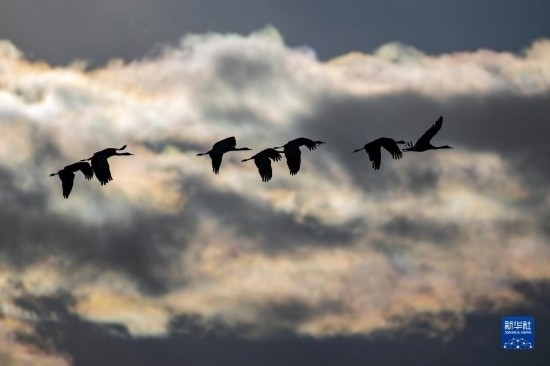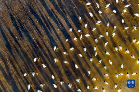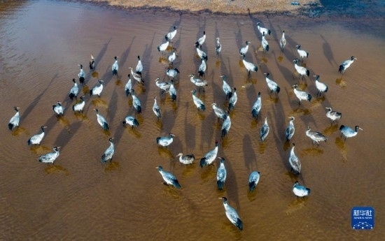 這是12月5日清晨在拉薩市林周縣虎頭山水庫拍攝的越冬黑頸鶴(無人機照片)。