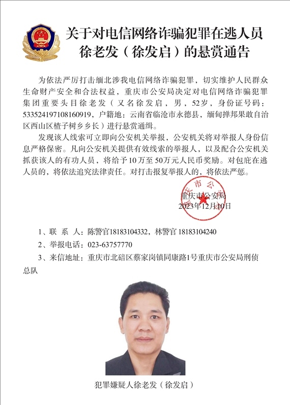 人民網(wǎng)北京12月10日電 (高清揚(yáng)、梁秋坪)據(jù)公安部消息,針對(duì)當(dāng)前緬北涉我電信網(wǎng)絡(luò)詐騙犯罪嚴(yán)峻形勢(shì),我公安機(jī)關(guān)先后對(duì)多名電信網(wǎng)絡(luò)詐騙犯罪集團(tuán)重要頭目進(jìn)行公開(kāi)通緝,形成強(qiáng)大震懾。近日,在掌握相關(guān)犯罪事實(shí)和證據(jù)的基礎(chǔ)上,遼寧、福建、重慶等地公安機(jī)關(guān)決定對(duì)白所成、魏懷仁、劉正祥等10名緬北果敢自治區(qū)電信網(wǎng)絡(luò)詐騙犯罪集團(tuán)重要頭目進(jìn)行公開(kāi)懸賞通緝,堅(jiān)決打掉犯罪分子囂張氣焰。