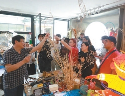 顧業(yè)亮(左一)向游客介紹展示秦淮燈彩制作。圖為南京歷史城區(qū)保護建設集團有限公司提供