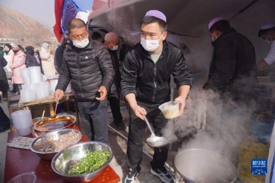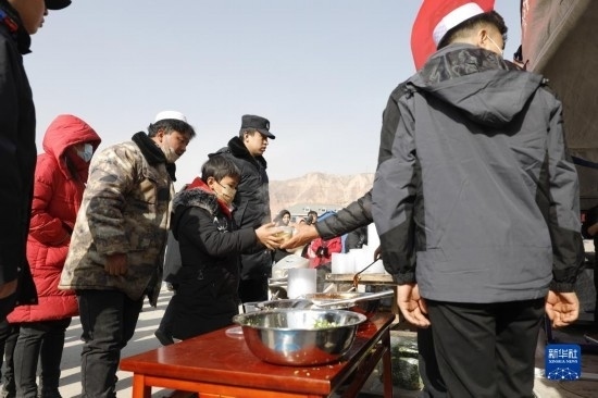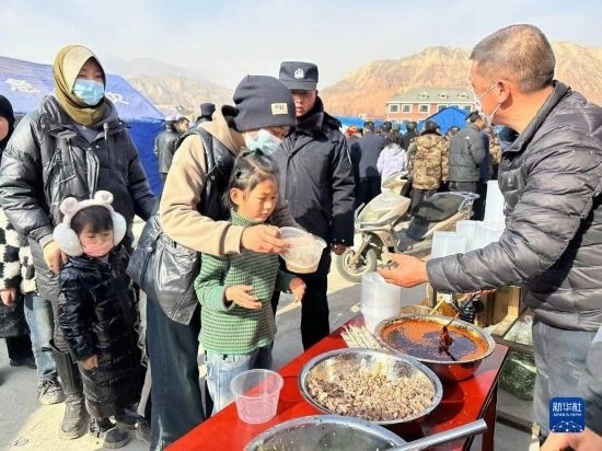 12月19日,在甘肅臨夏積石山縣大河家鎮(zhèn)大河村安置點,受災群眾領(lǐng)取愛心牛肉面。