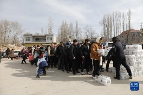 12月19日,在甘肅臨夏積石山縣大河家鎮(zhèn)大河村安置點,受災群眾領(lǐng)取礦泉水。