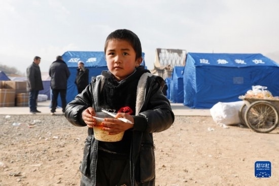12月19日,在甘肅臨夏積石山縣大河家鎮(zhèn)大河村安置點,小朋友領(lǐng)取愛心牛肉面。