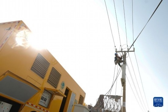 12月19日,在甘肅臨夏積石山縣大河家鎮(zhèn)大河村安置點,電力部門工作人員搶修電力設(shè)施。