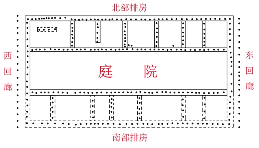 “從柱洞的分布規(guī)律來看,這一夯土臺基整體應是南北為排房建筑、中部為庭院、東西帶回廊的結構,規(guī)模宏大,結構復雜?!惫懦钦z址發(fā)掘現(xiàn)場負責人李博說。