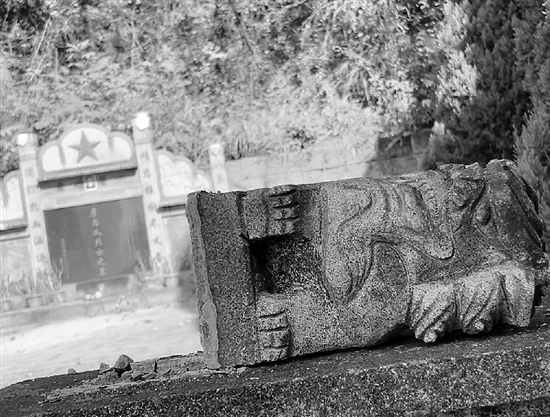 更讓人氣憤的是,修復過的墓地設施又遭到破壞。記者在現(xiàn)場看到,烈士墓護欄上的幾只小獅子有明顯的人為破壞痕跡,有兩只甚至被扔到了臺階下方,而由金華市婺城區(qū)退役軍人事務局設立的一根有烈士資料二維碼的立柱,也被連根拔起。