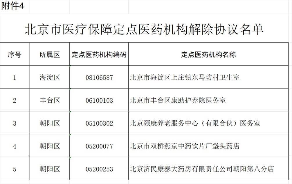 北京市海淀區(qū)上莊鎮(zhèn)東馬坊村衛(wèi)生室等5家定點醫(yī)藥機(jī)構(gòu)因已注銷,申請解除協(xié)議。經(jīng)市、區(qū)醫(yī)保經(jīng)辦機(jī)構(gòu)審核,對上述5家定點醫(yī)藥機(jī)構(gòu)解除協(xié)議(見附件4)。
