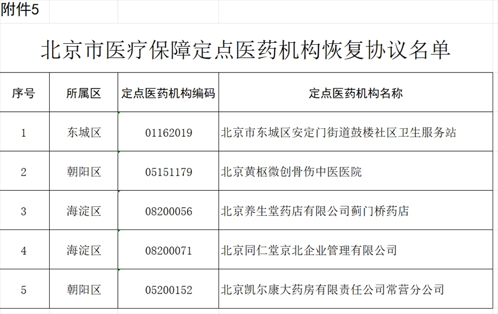 北京市東城區(qū)安定門街道鼓樓社區(qū)衛(wèi)生服務(wù)站等5家醫(yī)藥機(jī)構(gòu)申請恢復(fù)協(xié)議,經(jīng)市、區(qū)醫(yī)保經(jīng)辦機(jī)構(gòu)審核,上述5家醫(yī)藥機(jī)構(gòu)已經(jīng)具備承擔(dān)醫(yī)療保障任務(wù)的條件,現(xiàn)決定對上述5家醫(yī)藥機(jī)構(gòu)恢復(fù)協(xié)議(見附件5)。