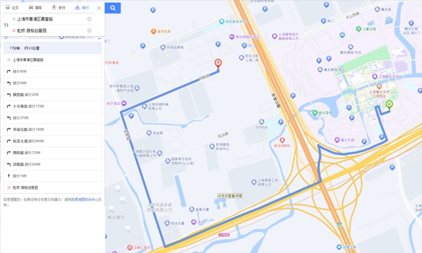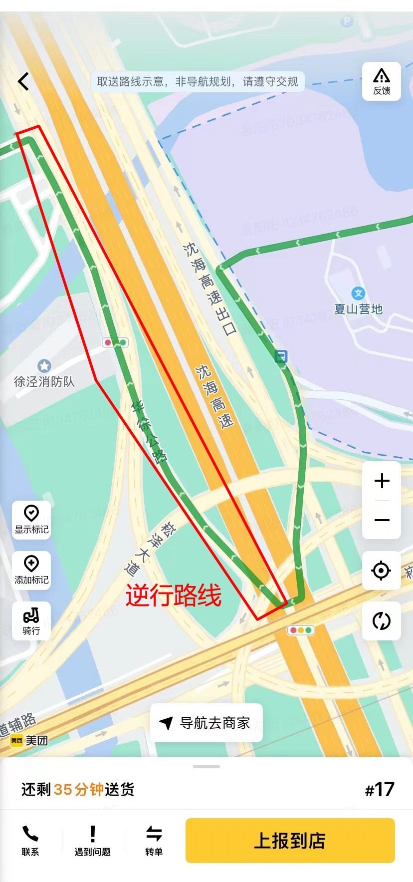 “途經(jīng)滬青平公路時,平臺也愛規(guī)劃逆行路線?!标愱栮柼峁┑牡?條逆行路線正屬于這一情況。這是從京華路187弄送往南山雨果小區(qū)的一單,平臺規(guī)劃的路線中,指示騎手從明珠路右拐進入滬青平公路向西騎行至葉聯(lián)路再向南。可是,滬青平公路在葉聯(lián)路路口處沒有過街橫道線,此時,平臺索性規(guī)劃騎手沿著滬青平公路南側(cè)逆向騎行。1月8日,記者實地走了一遍這段路線:若騎手沿著滬青平公路北側(cè)騎行,需一直向西騎到徐盈路才能過街,再沿著滬青平公路南側(cè)向東抵達葉聯(lián)路。手機顯示,繞行路線比美團平臺規(guī)劃路線遠(yuǎn)了1.2公里。