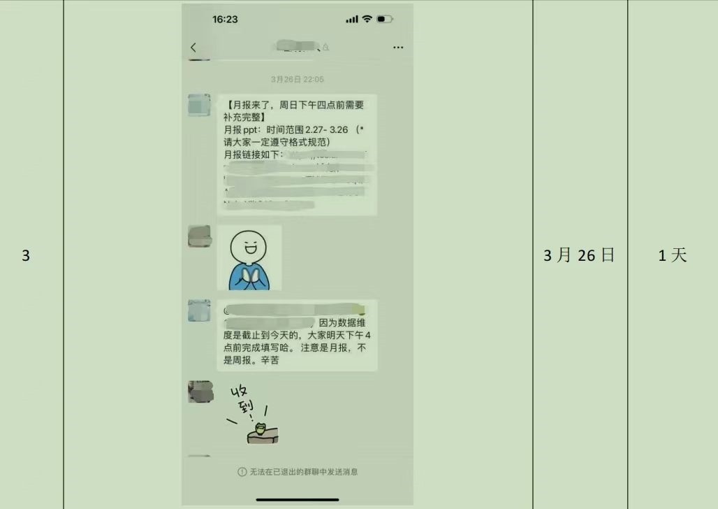 張?bào)以谝凰伤鶎?shí)習(xí),一次工作任務(wù)中,她常在夜晚23點(diǎn)、凌晨1點(diǎn)或5點(diǎn)收到溝通對(duì)象的消息。那項(xiàng)工作是要處理未成年人退款,有一個(gè)家長不怎么管孩子,事情需要等孩子放學(xué)后處理,張?bào)医o這位家長發(fā)消息時(shí)常收不到回復(fù)。
