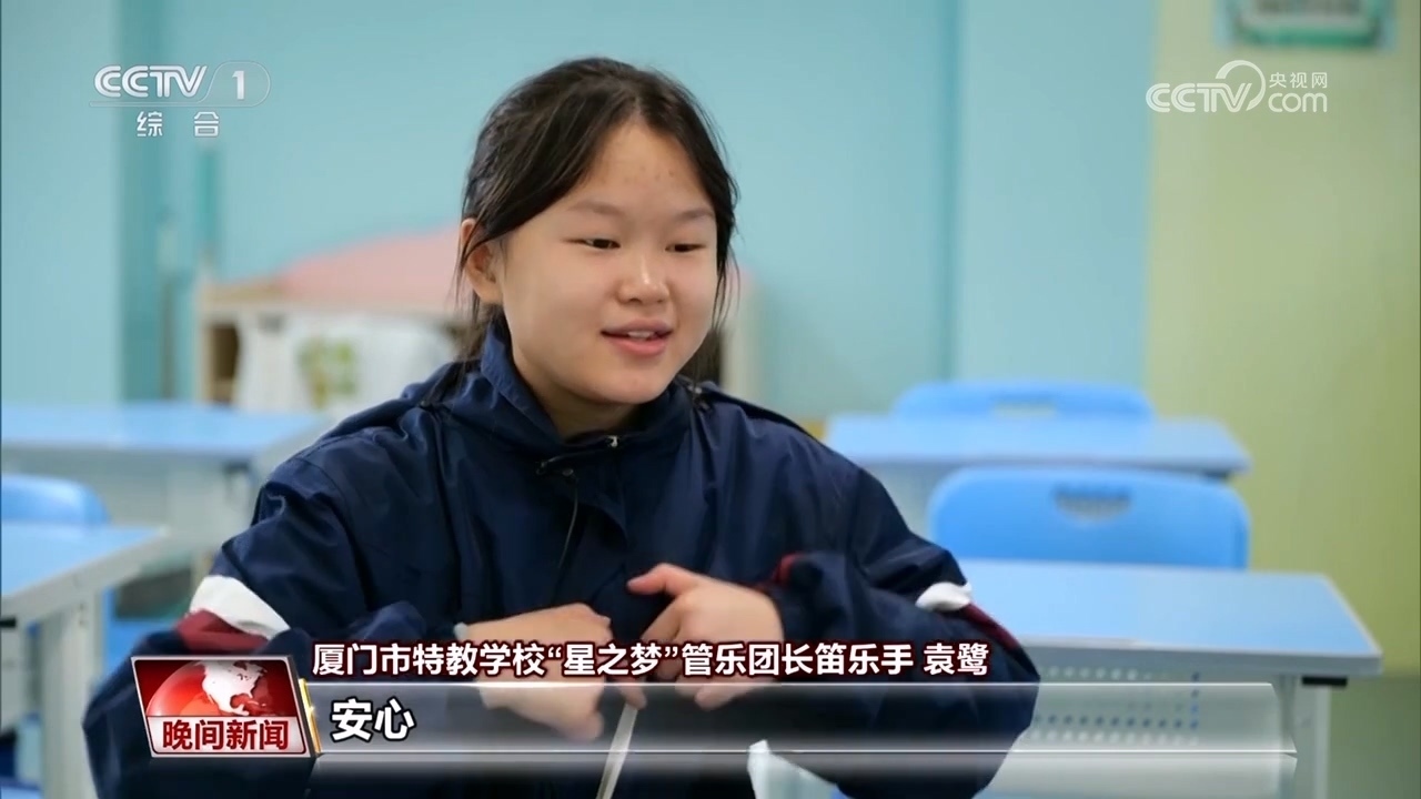 廈門市特教學(xué)?!靶侵畨簟惫軜穲F(tuán)長笛 袁鷺:我跟不上他們,然后老師肩膀拍我才可以跟得上。