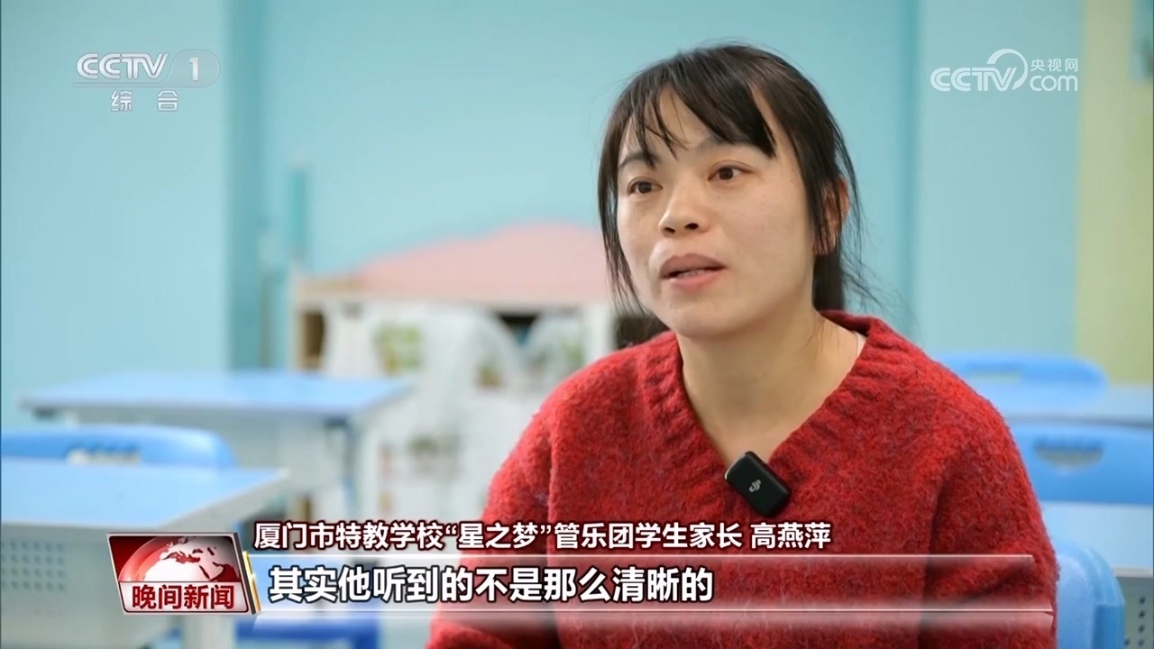廈門市特教學(xué)?!靶侵畨簟惫軜穲F(tuán)學(xué)生家長 高燕萍:其實他聽到的不是那么清晰的,但是他會覺得這個聲音很美,他用手語告訴我,他覺得很美。