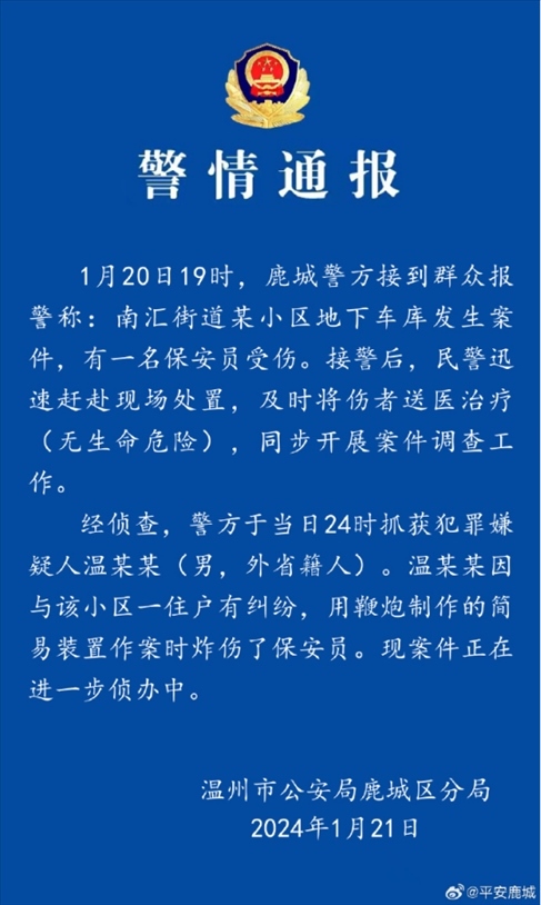 ·溫州警方通報(bào)“某小區(qū)1名保安被炸傷”:犯罪嫌疑人已被抓獲。