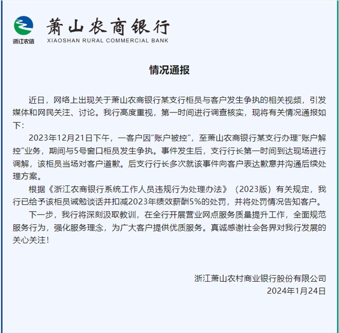·杭州蕭山農(nóng)商銀行柜員對客戶大吼“滾”,銀行回應(yīng):扣減5%績效。